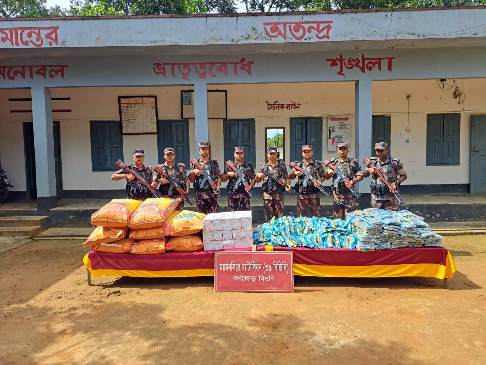মঙ্গলবার (১৯ আগস্ট) ভোরে শেরপুরের জেলার শ্রীবরদী উপজেলা ও ময়মনসিংহ জেলার হালুয়াঘাট সীমান্ত এলাকায় এসব মালামাল জব্দ করা হয়েছে।