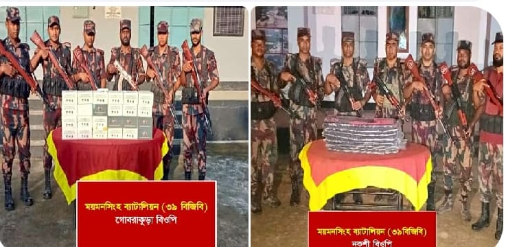 ময়মনসিংহ ব্যাটালিয়ন (৩৯ বিজিবি)’র পৃথক অভিযানে ময়মনসিংহের হালুয়াঘাট ও শেরপুরের ঝিনাইগাতী সীমান্ত এলাকা থেকে বিপুল পরিমাণ ভারতীয় পণ্য জব্দ করা হয়েছে। গোপন সংবাদের ভিত্তিতে গত ১৫ অক্টোবর রাতে গোবরাকুড়া ও গজনী সীমান্তে অভিযান চালিয়ে বিজিবি সদস্যরা এসব পণ্য আটক করেন।