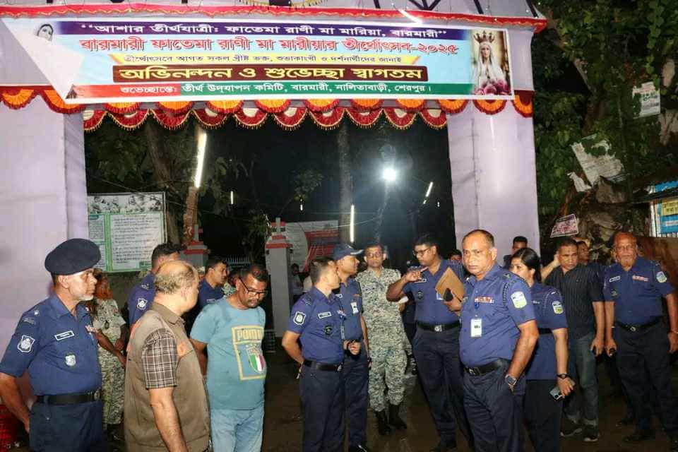 শেরপুর জেলার নালিতাবাড়ী থানাধীন বারোমারী সাধু লিও খ্রিস্টান ধর্মপল্লীতে দুই দিনব্যাপী”ফাতেমা রাণী মা মারীয়ার তীর্থোৎসব-২০২৫’ উদযাপন উপলক্ষে আইনশৃঙ্খলা রক্ষা ও নিরাপত্তা নিশ্চিতকরণে ব্রিফিং প্যারেড অনুষ্ঠিত হয়েছে।